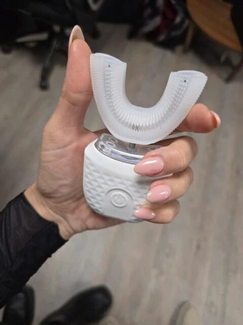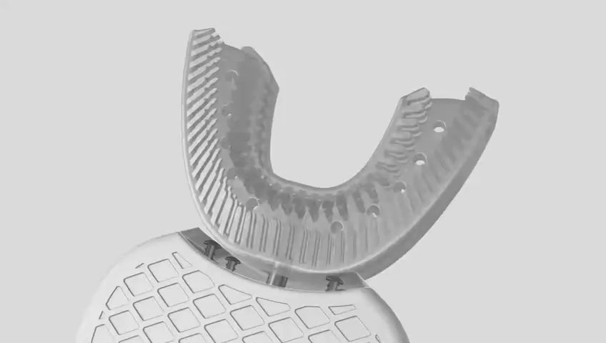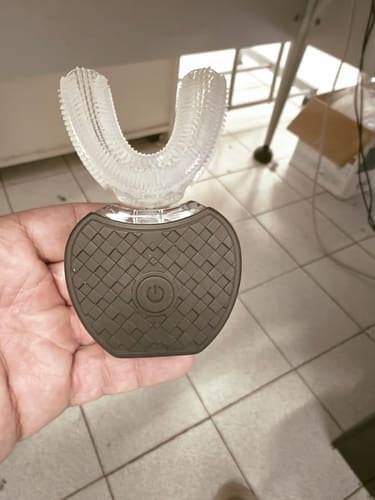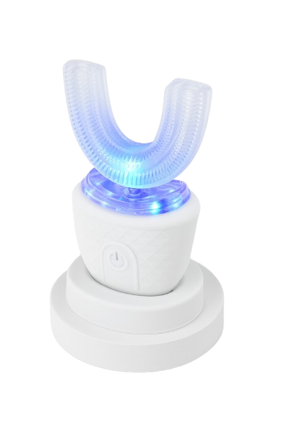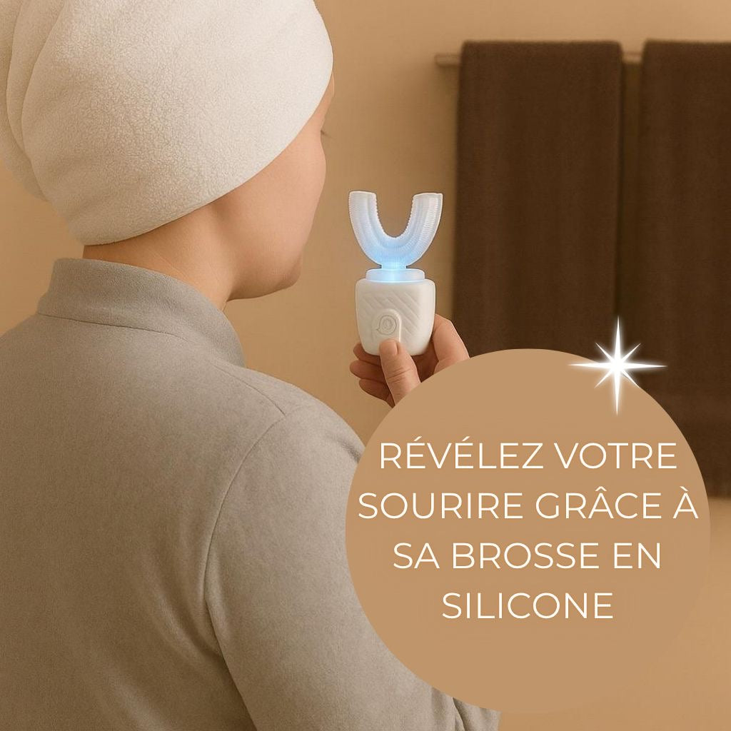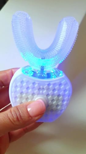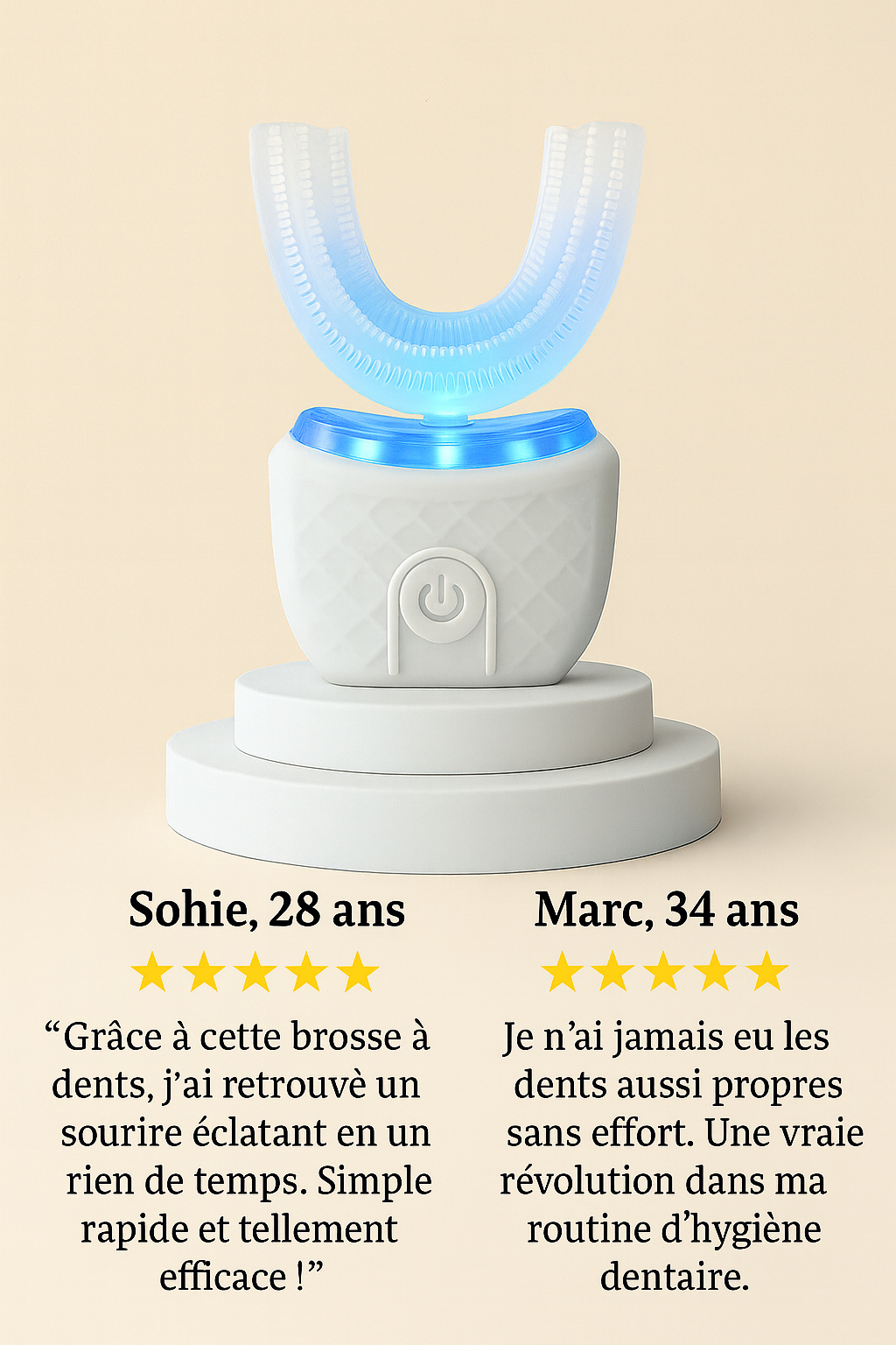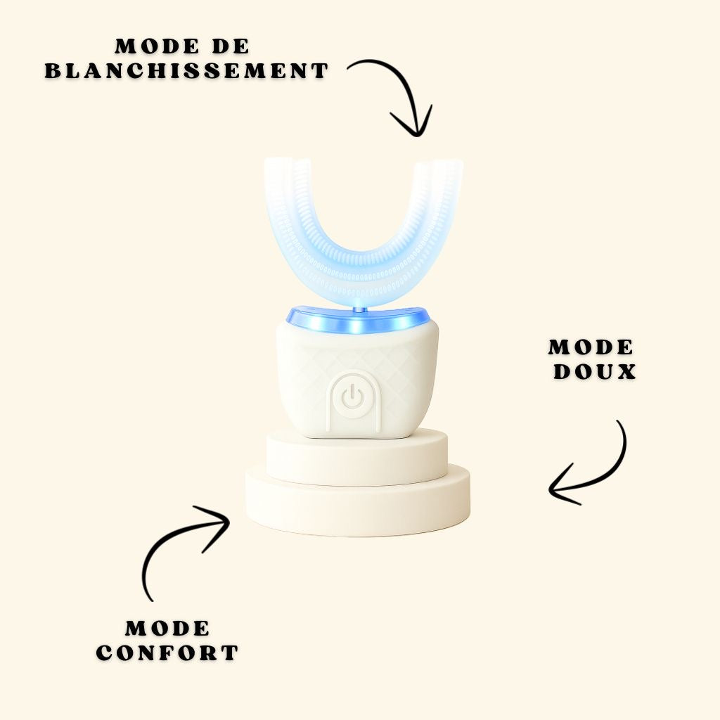 C’est une brosse innovante qui a une tête en forme de U recouverte de poils en silicone. Elle entoure toutes les dents en même temps et utilise des vibrations soniques pour les nettoyer.