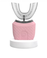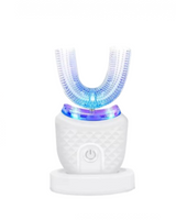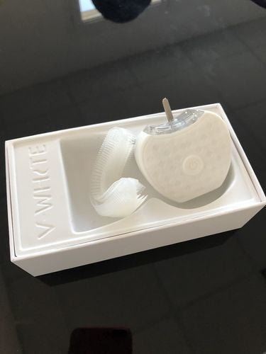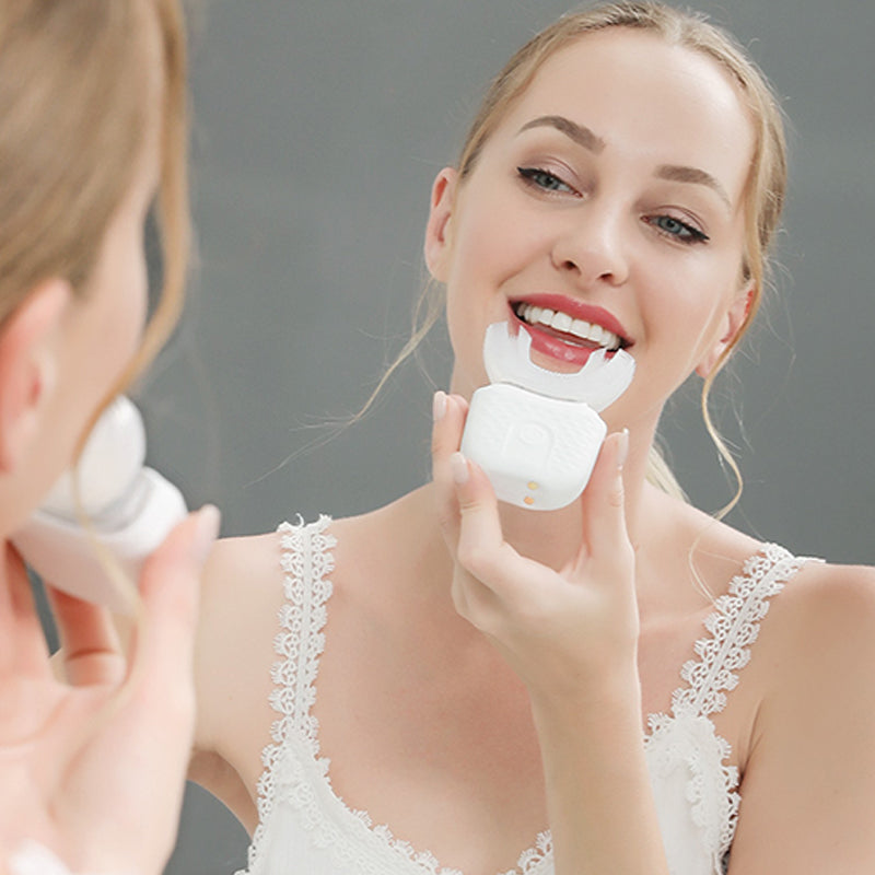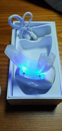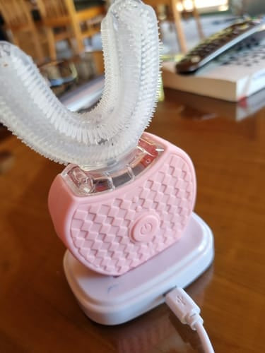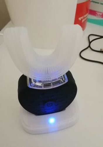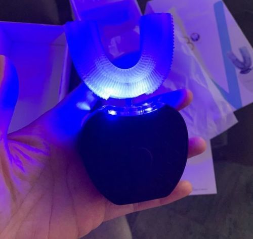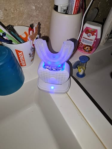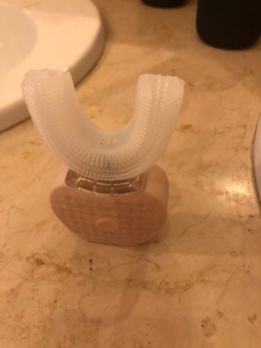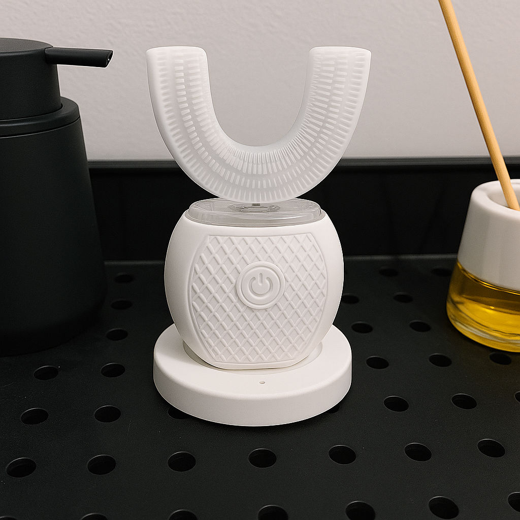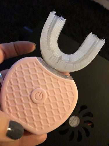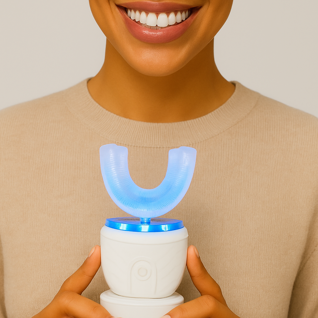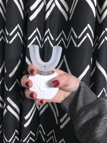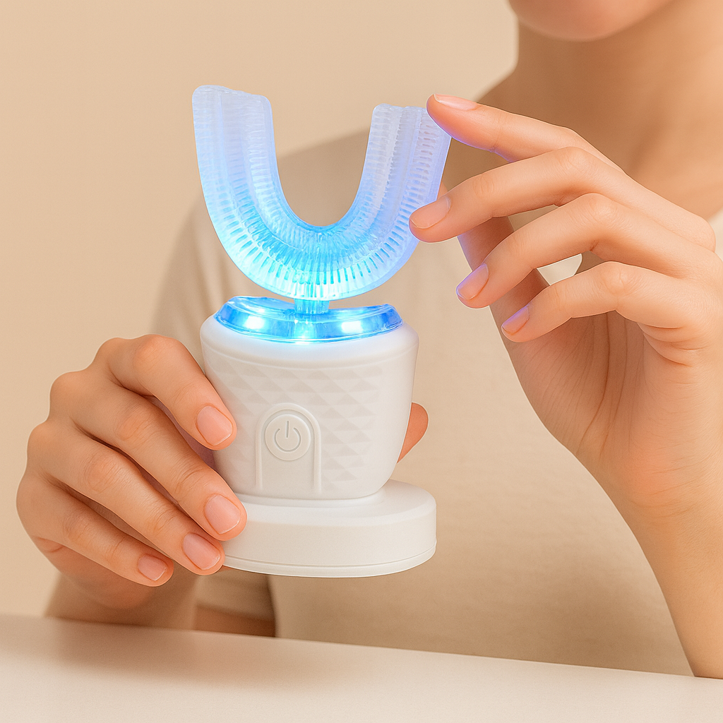 C’est une brosse innovante qui a une tête en forme de U recouverte de poils en silicone. Elle entoure toutes les dents en même temps et utilise des vibrations soniques pour les nettoyer.
